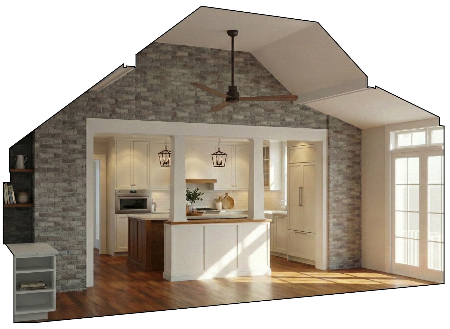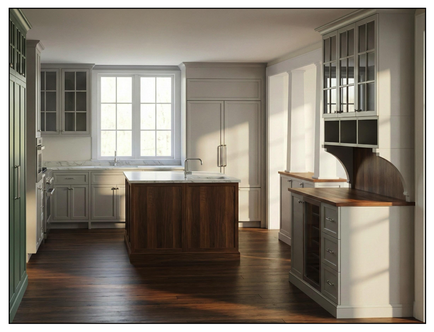 brennan+company architects is working on an renovation to a 1935 house in Chevy Chase, MD. The renderings show the new kitchen and dining rooms which are connected by the colonnaded island.