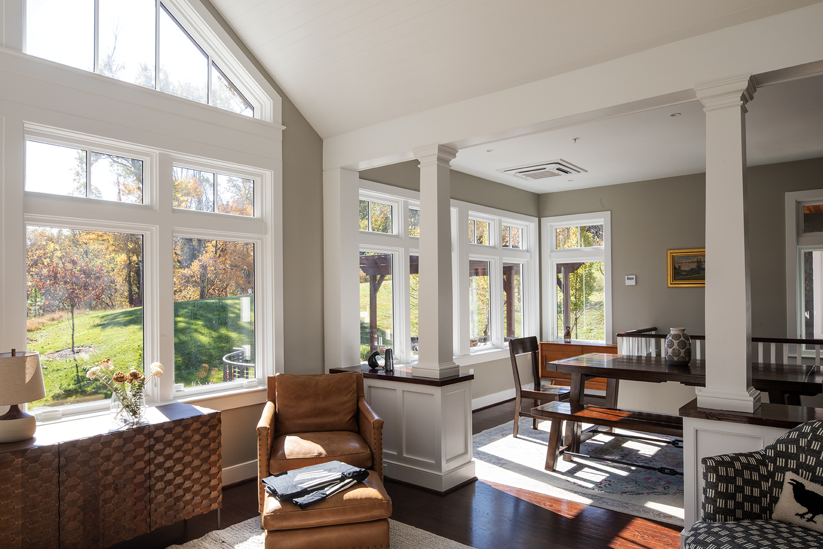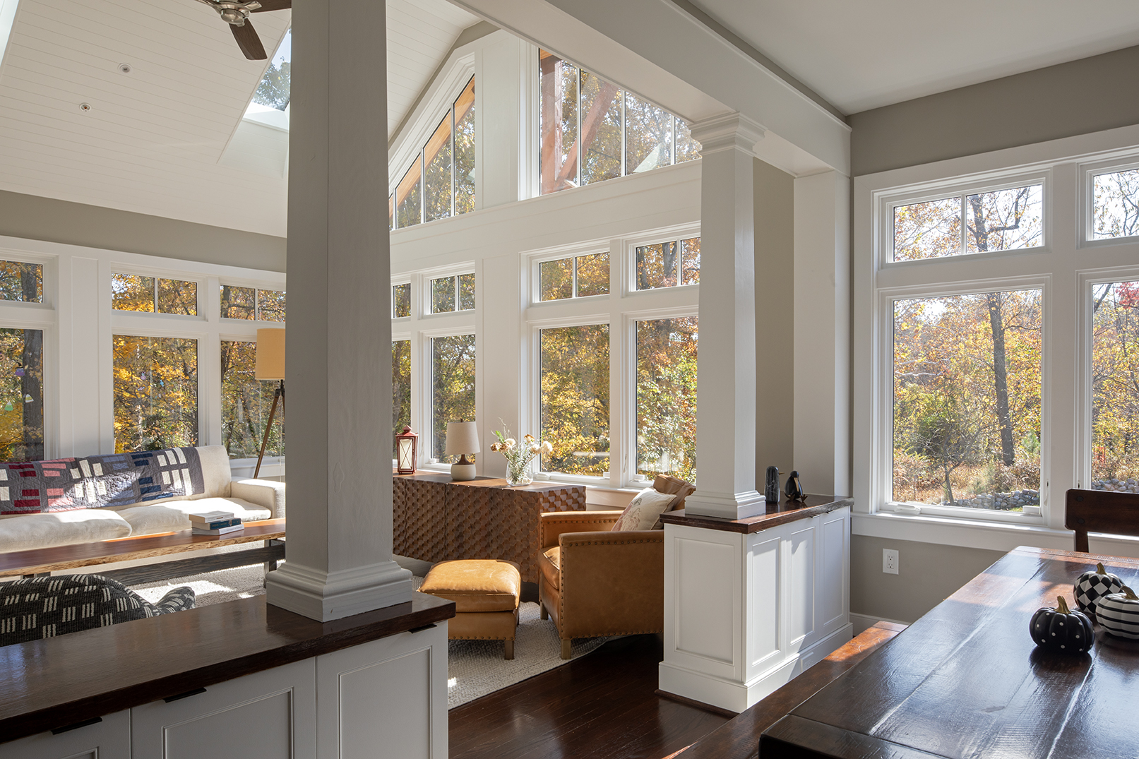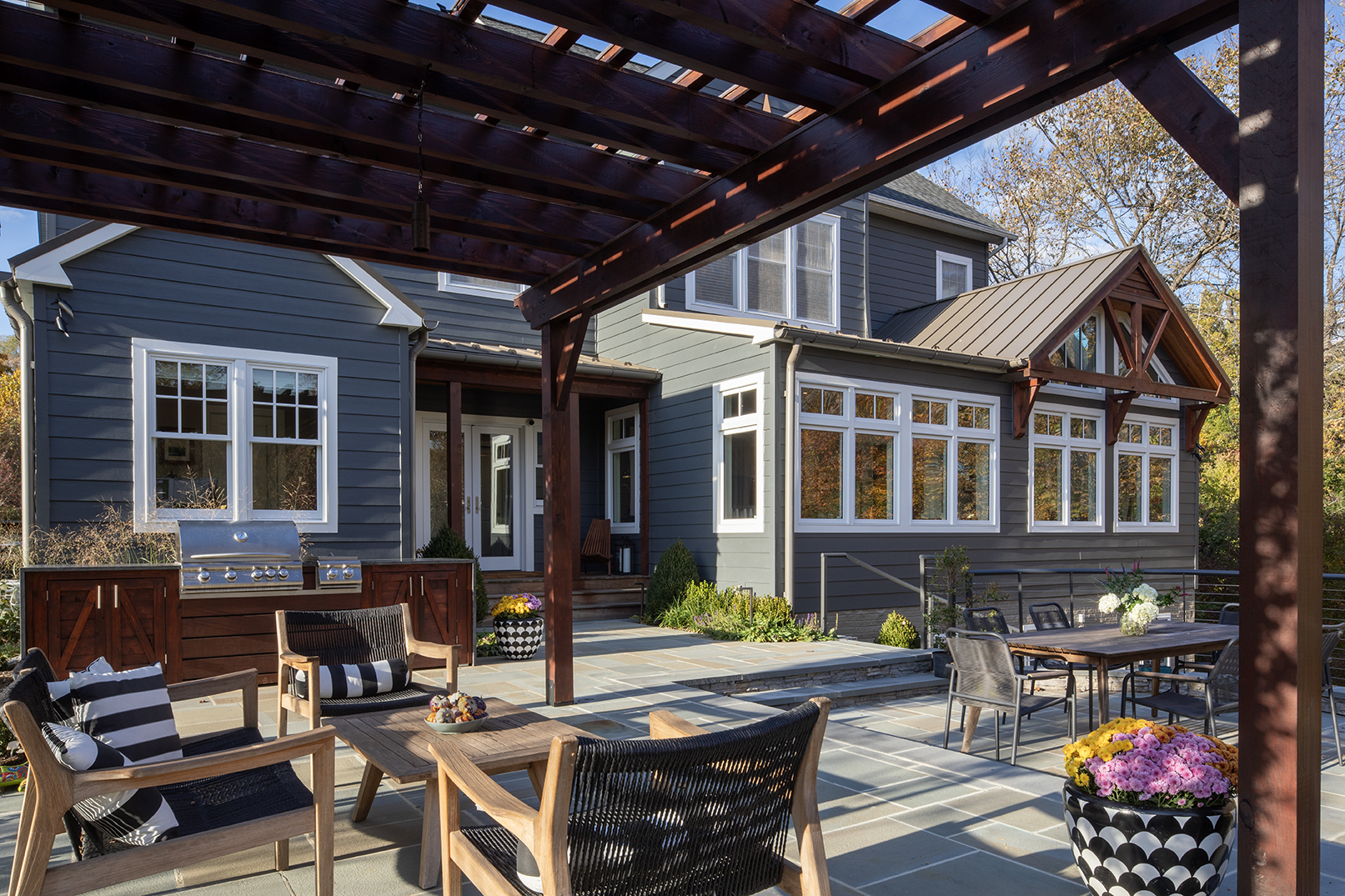 Located in Ellicott City, north of the historic district, this house was built in 2014 in a quasi-Craftsman aesthetic. The owners with their growing family enlisted brennan+company architects to add to their existing house in a thoughtful manner and re-envision their backyard site with two stepped terraces for hosting and living connected by a winding stone stair. Additional sitework included a bespoke grill enclosure and a stained cedar pergola, perfect for hosting family and friends. Brennan+company worked with the owners to create a new and inviting sunroom addition with a guest suite in the basement below. A second addition contains the owners’ new office with views toward the yard and landscape. A covered porch creates an inside-outside connection between the mudroom and the two new additions on either side.